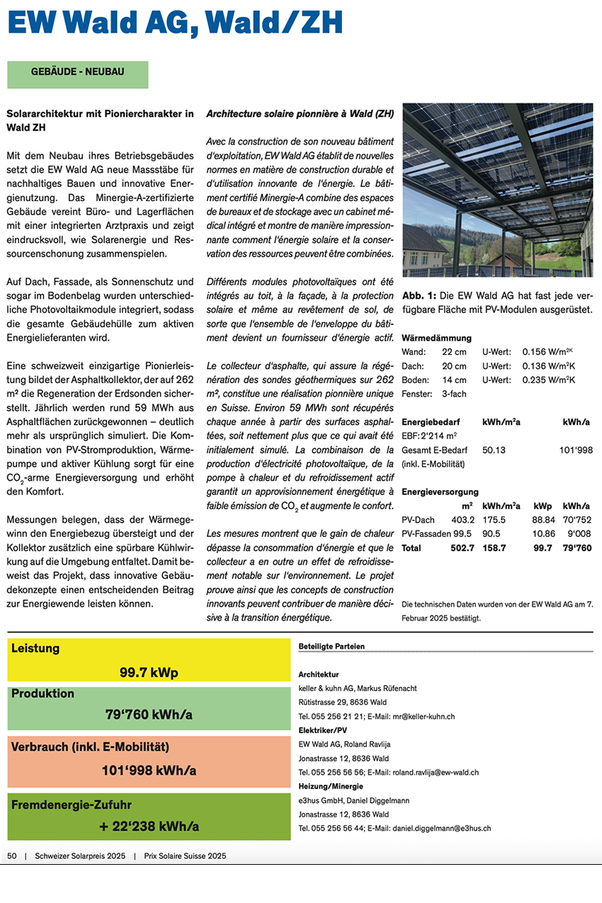 Das Betriebsgebäude der EW Wald AG konnte die Jury mit der innovativen Energienutzung am Gebäude und der Pionierleistung der Ashaltkollektoren überzeugen. keller & kuhn ag verantwortlich für das Bauprojekt und die Ausführungsplanung durfte zusammen mit e3hus GmbH die einzelnen Puzzleteile gewinnbringend zusammensetzen.
