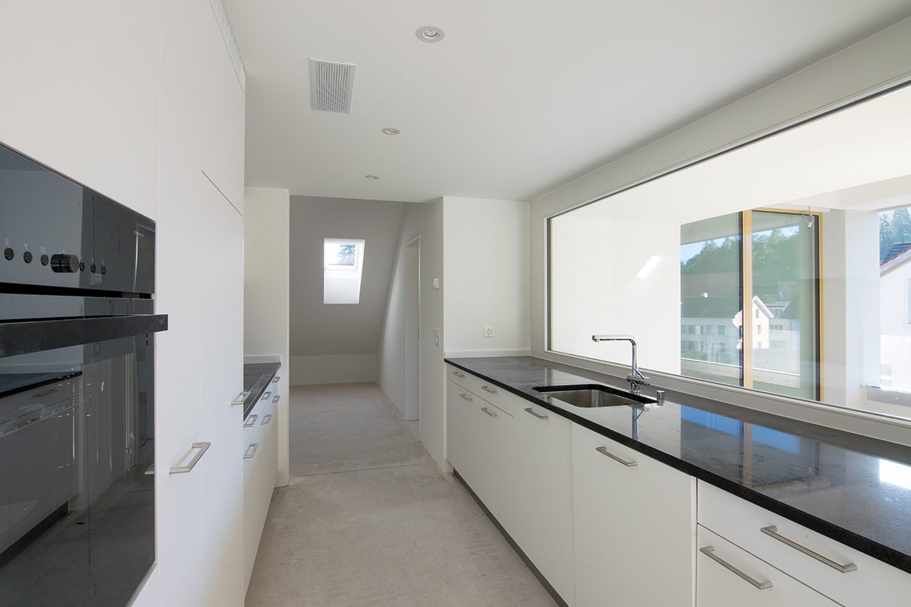 Die Bauparzelle ist eingebunden zwischen Kirche, Ladenlokal und Wohnbauten. Künftig entstehen in unmittelbare Nähe weitere Verkaufsflächen und in direkter Nachbarschaft ein neues Alters- und Pflegeheim. Es galt die künftige Entwicklung in den Entwurfsprozess einzubinden und entsprechend mit Volumen und Aussenraum zu reagieren.